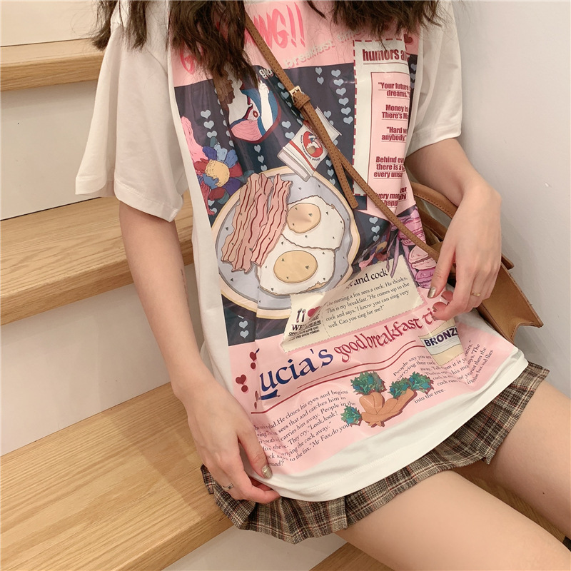 Cute Funny Cartoon Egg Bacon Breakfast Food Graphic Short Sleeve Shirt Tee T-shirt E-Girl Kawaii Korean Japanese Harajuku Chinese Retro Streetwear