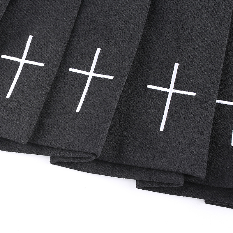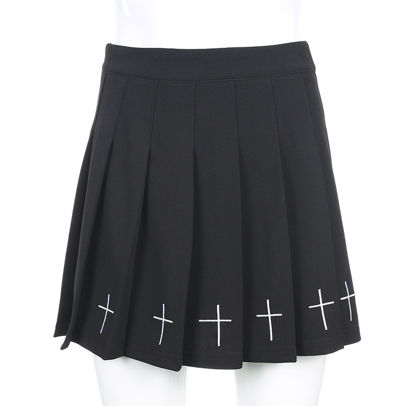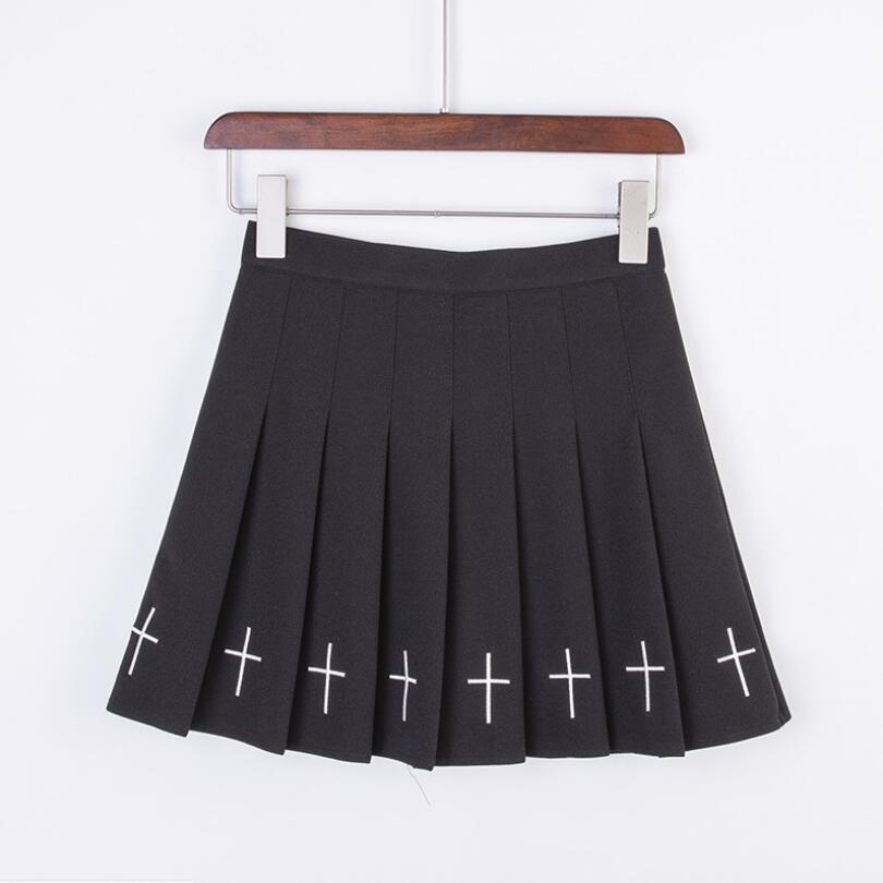Cute Black Cross Print Goth Punk Pleated High Waisted Mini Skirt Bottom E-Girl Kawaii Korean Japanese Harajuku Retro Streetwear