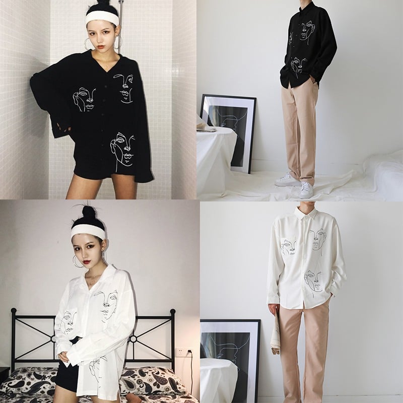 Cute Face Asymmetrical White Long Sleeve Shirt Tee T-shirt Top Blouse E-Girl Kawaii Korean Japanese Harajuku Retro Streetwear Aesthetic