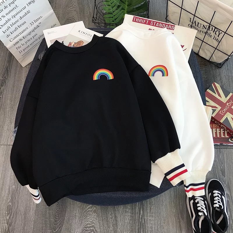 Cute Rainbow Embroidery Fleece Hoodie Sweater Sweatshirt Pullover 90s Oversized Long Sleeve E-Girl Kawaii Korean Japanese Harajuku Retro Streetwear