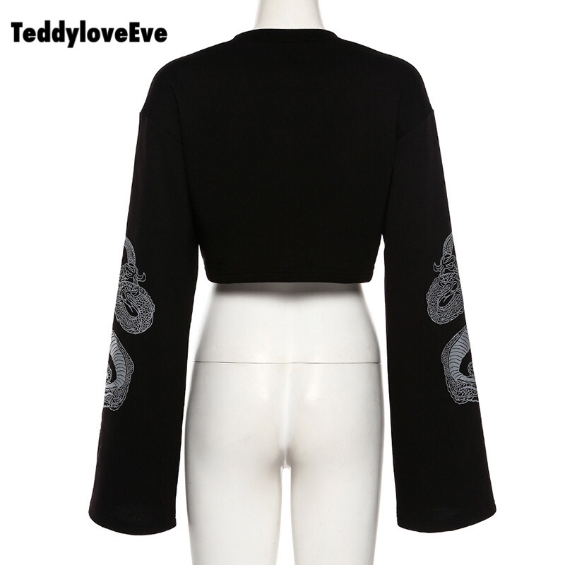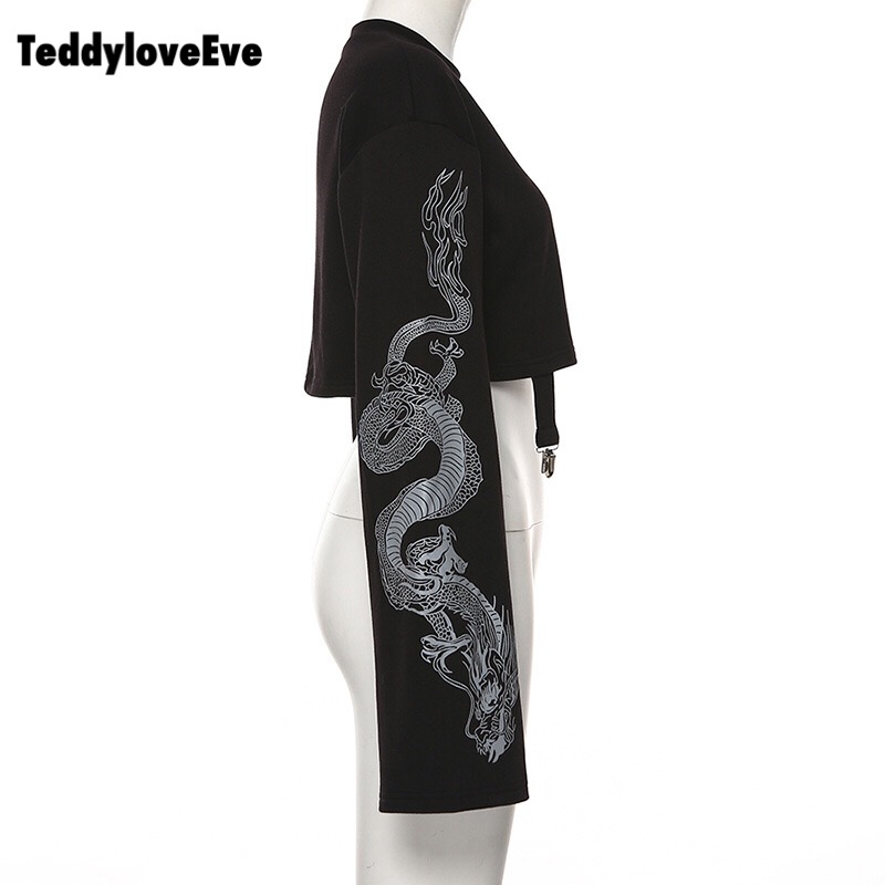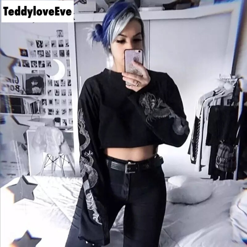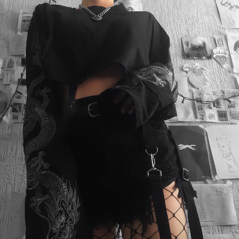 Sexy Black Goth Punk Dragon Print Vintage Sweatshirt Loose Crop Top Long Sleeve Shirt T-shirt E-Girl Kawaii Korean Japanese Harajuku Streetwear
