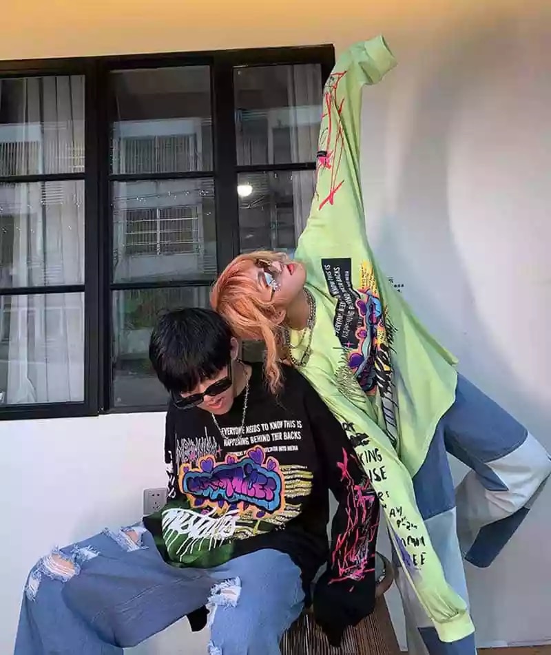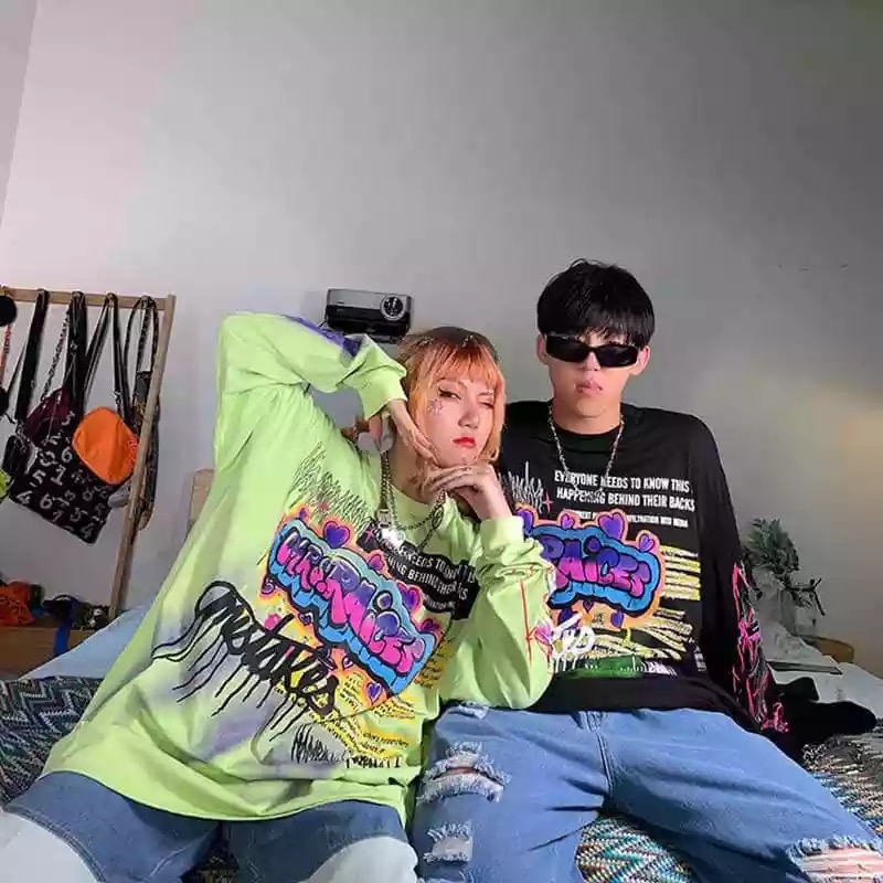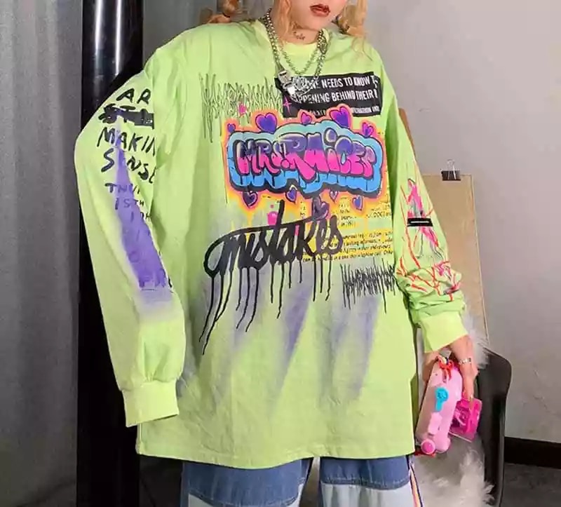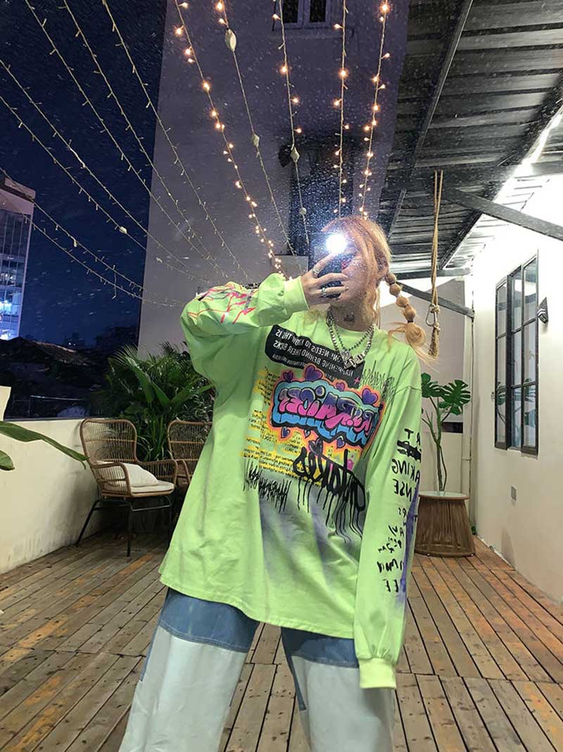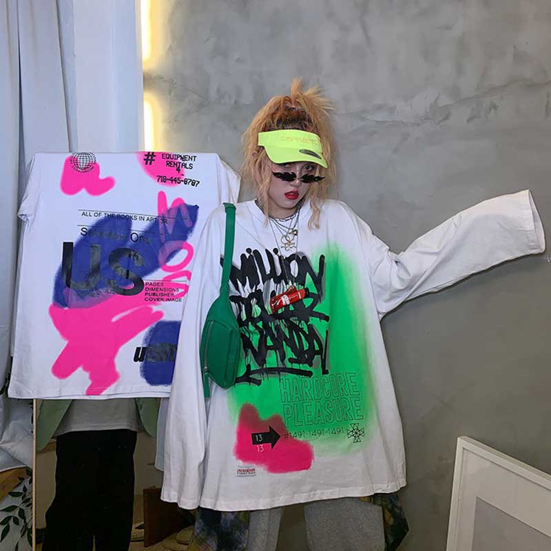Cute Graffiti Art Graphic Print Punk Baggy Hip Hop Oversized Long Sleeve Tee Shirt T-shirt Top E-Girl Kawaii Korean Japanese Harajuku Streetwear
