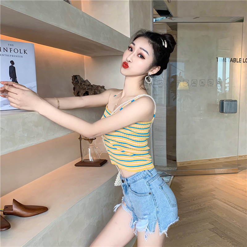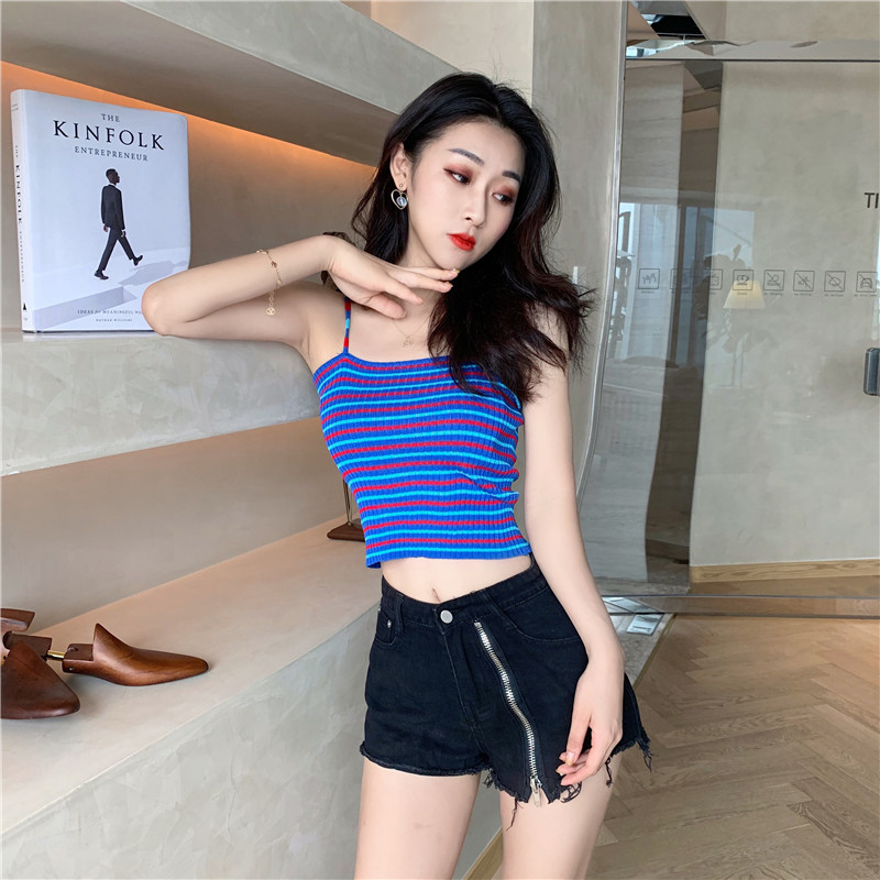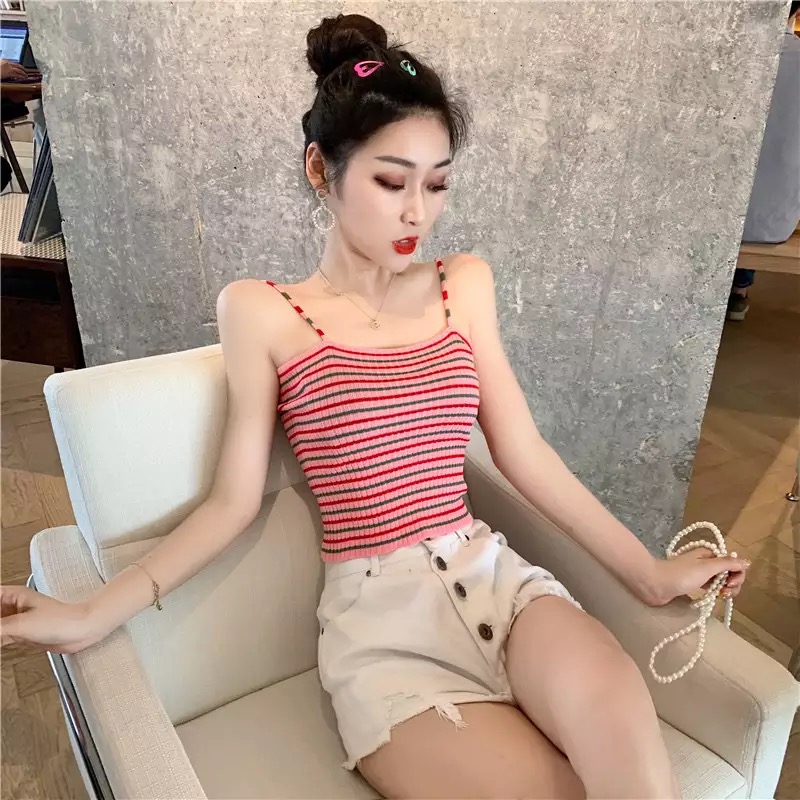 Cute Stripe Knit Cropped Tank Top Spaghetti Strap Camisole Sleeveless Shirt T-shirt Top E-Girl Kawaii Korean Japanese Harajuku Streetwear