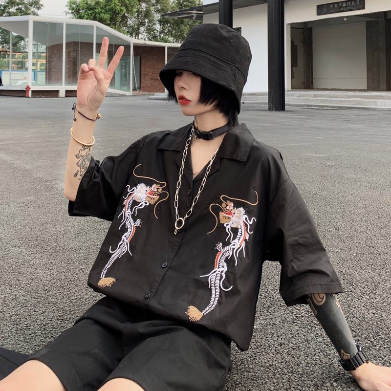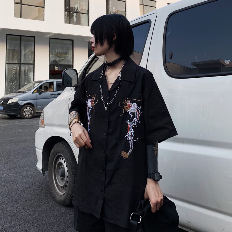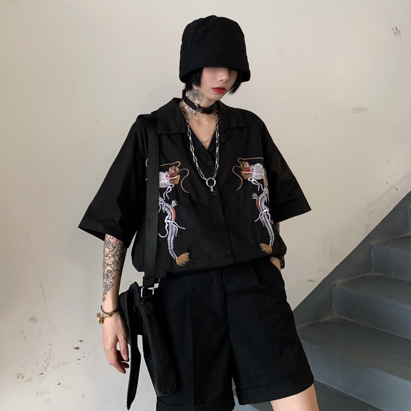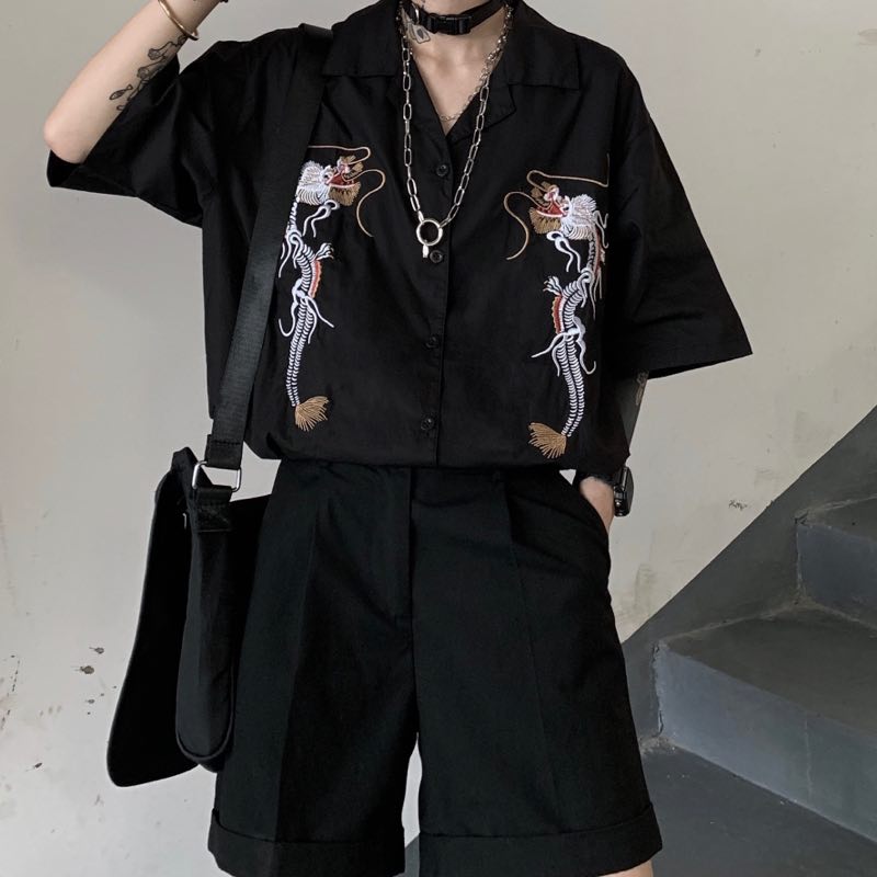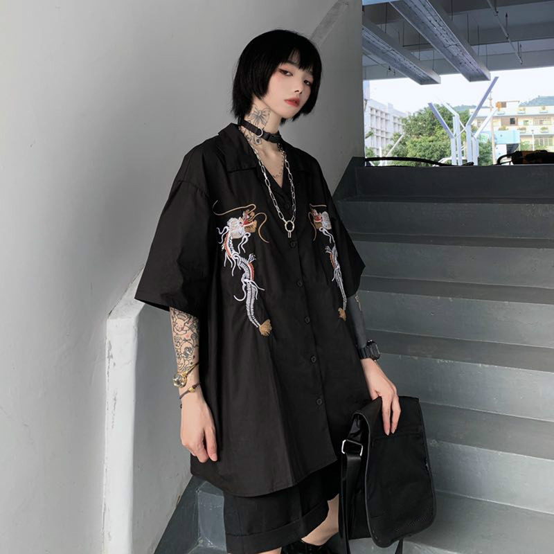 Dragon Embroidery Vintage Black Blouse Button Down Casual Loose Short Sleeve Tee Shirt T-shirt Top E-Girl Kawaii Korean Japanese Harajuku Streetwear