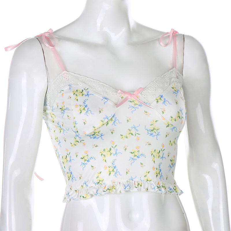 Lace Frill Floral Print Crop Top Summer Sleeveless Camisole Causal E-Girl Kawaii Korean Japanese Harajuku Streetwear