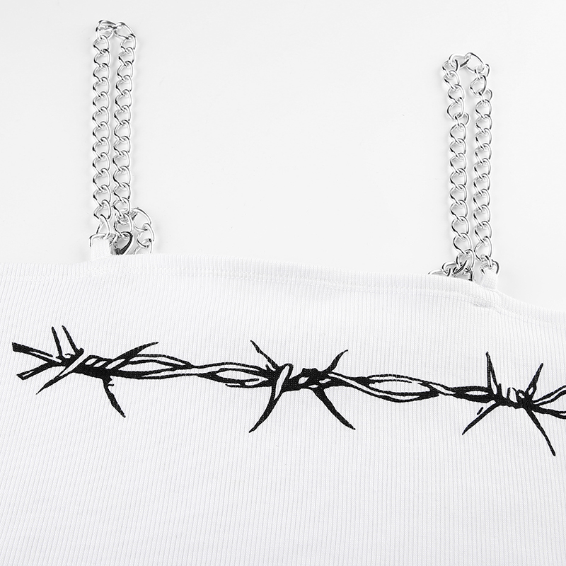Sexy Barb Wire Print Sleeveless Shirt Crop Top Tank Camisole Metal Chain Strap Casual Punk Summer E-Girl Kawaii Korean Japanese Harajuku Streetwear