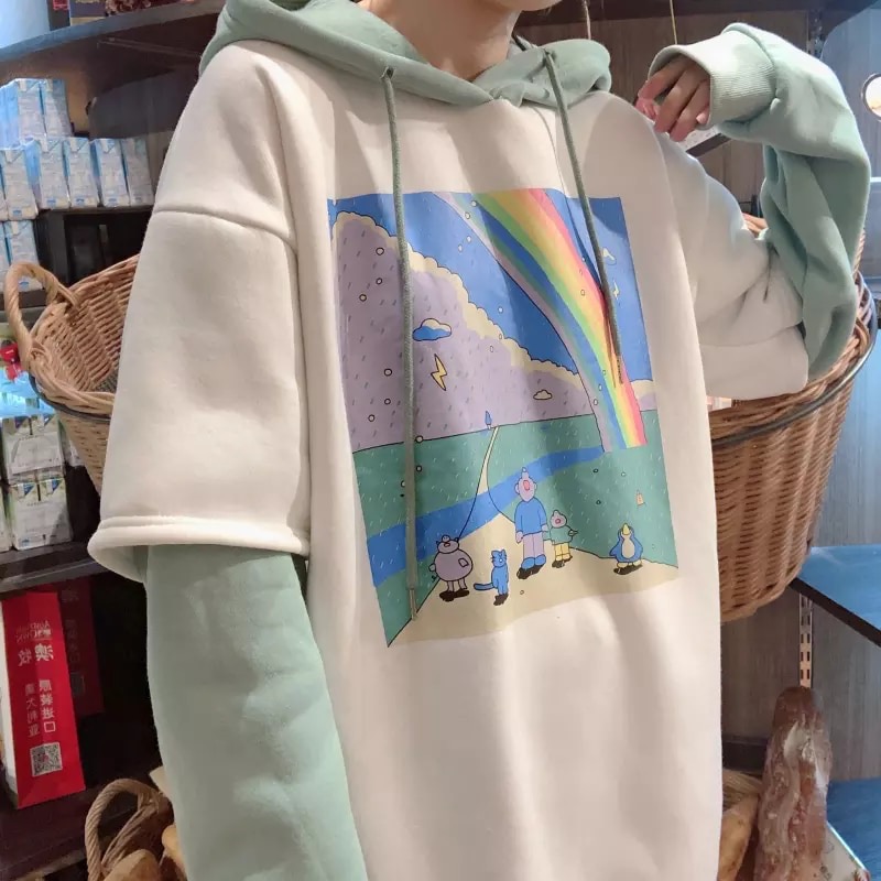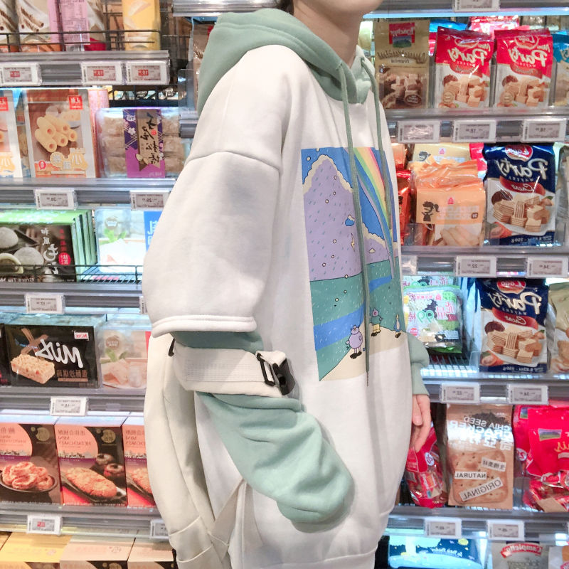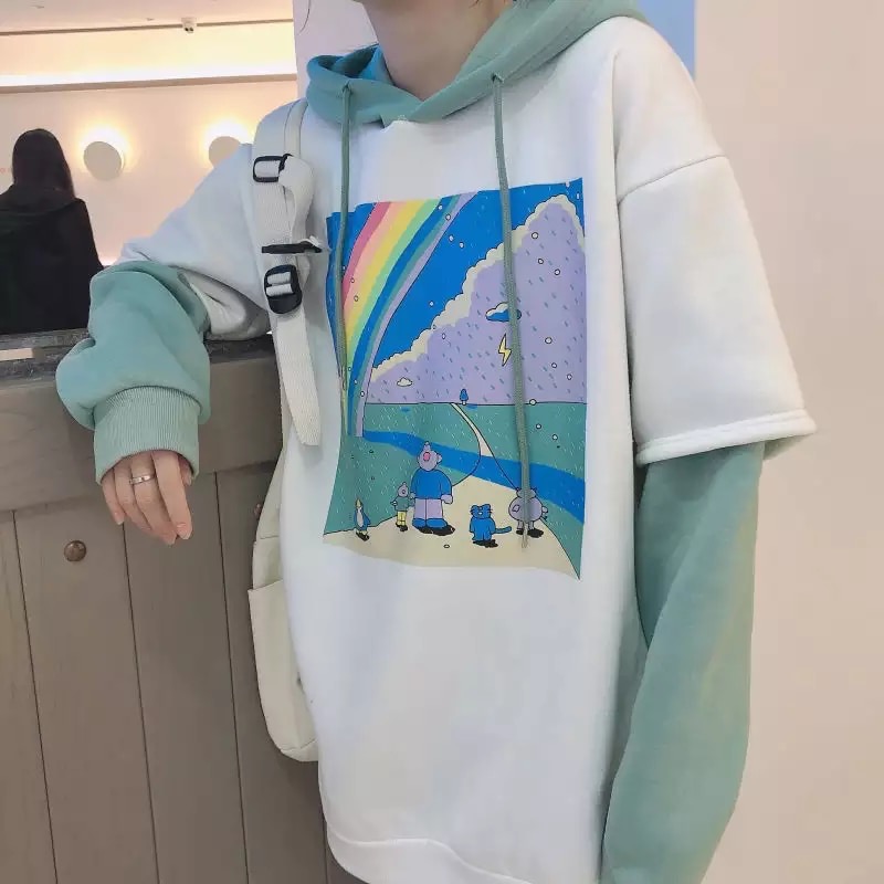 Rainbow Cartoon Print Hoodie Patchwork Loose Drawstring Sweatshirt Sweater Long Sleeve Pullover E-Girl Kawaii Korean Japanese Harajuku Streetwear