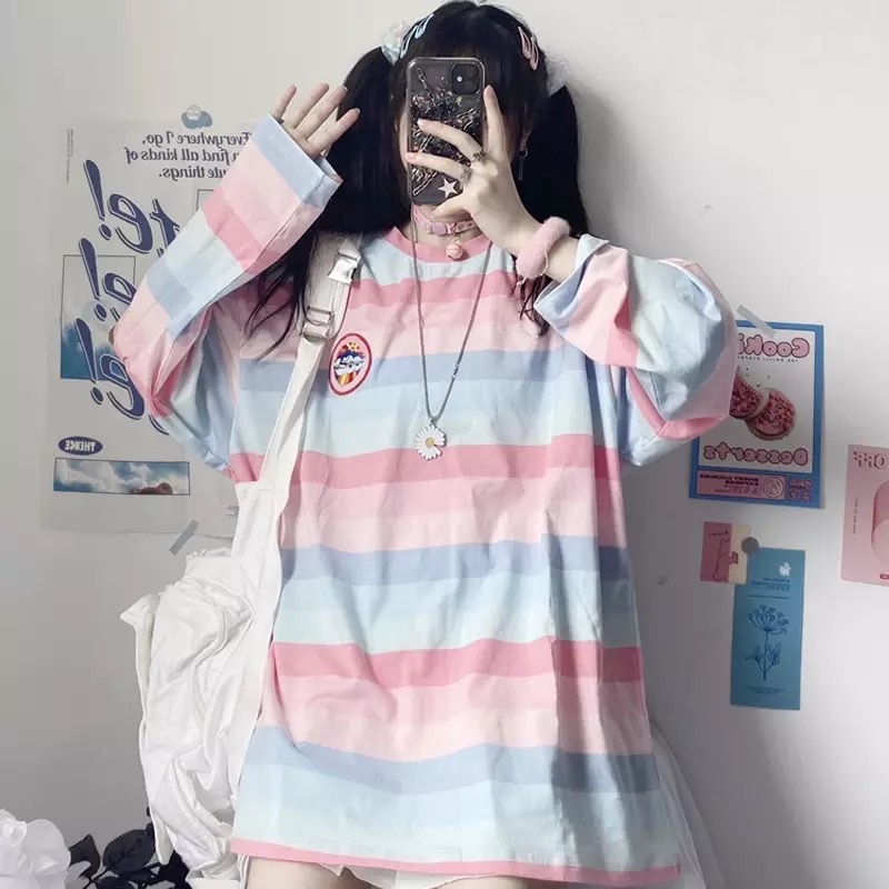 Pastel Rainbow Stripe Colorful Loose Oversize Long Sleeve Shirt T-shirt Top Embroidery Casual Autumn E-Girl Kawaii Korean Japanese Harajuku Streetwear