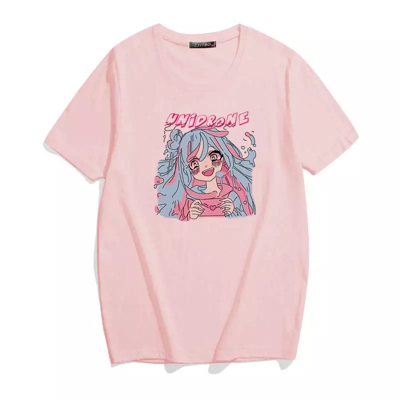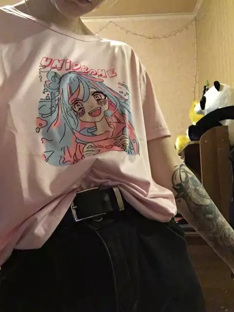 Cute Sweet Vintage Pastel Pink Anime Girl Cartoon Print Short Sleeve Shirt Loose T-shirt Top E-Girl Kawaii Korean Japanese Harajuku Streetwear