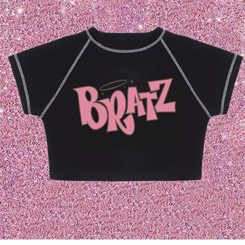 Cute Black Bratz Cartoon Vintage Sexy Crop Top Short Sleeve Shirt Tee T-shirt Summer Casual E-Girl Kawaii Korean Japanese Harajuku Streetwear