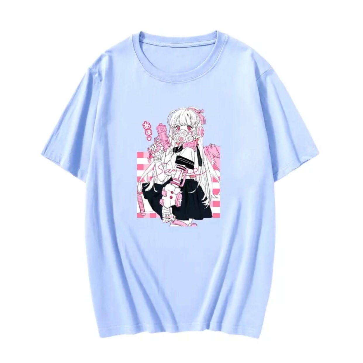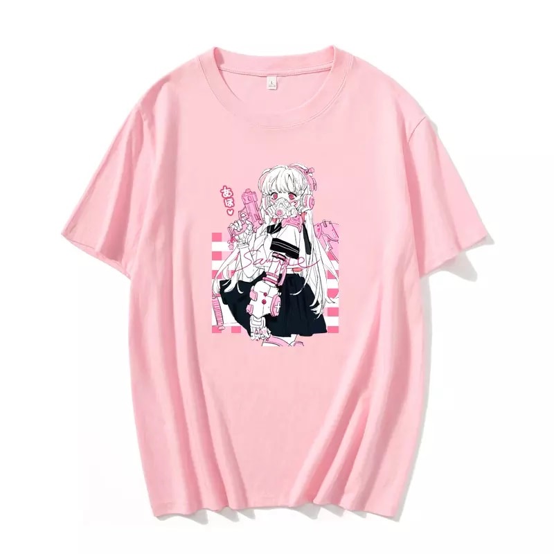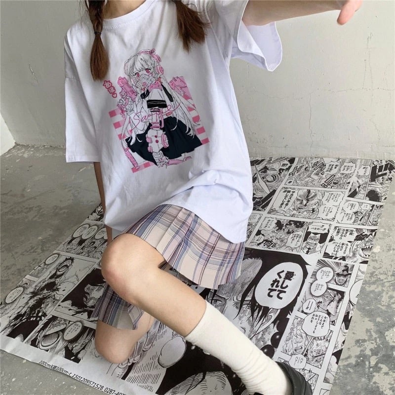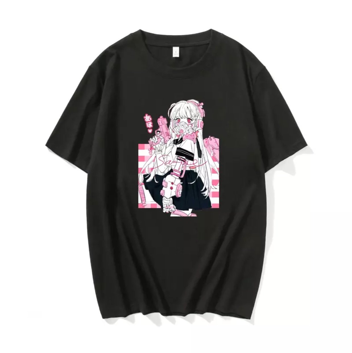 Cute Pink Black Sweet Vintage Anime Girl Cartoon Loose Short Sleeve Shirt Tee T-shirt Summer Casual E-Girl Kawaii Korean Japanese Harajuku Streetwear