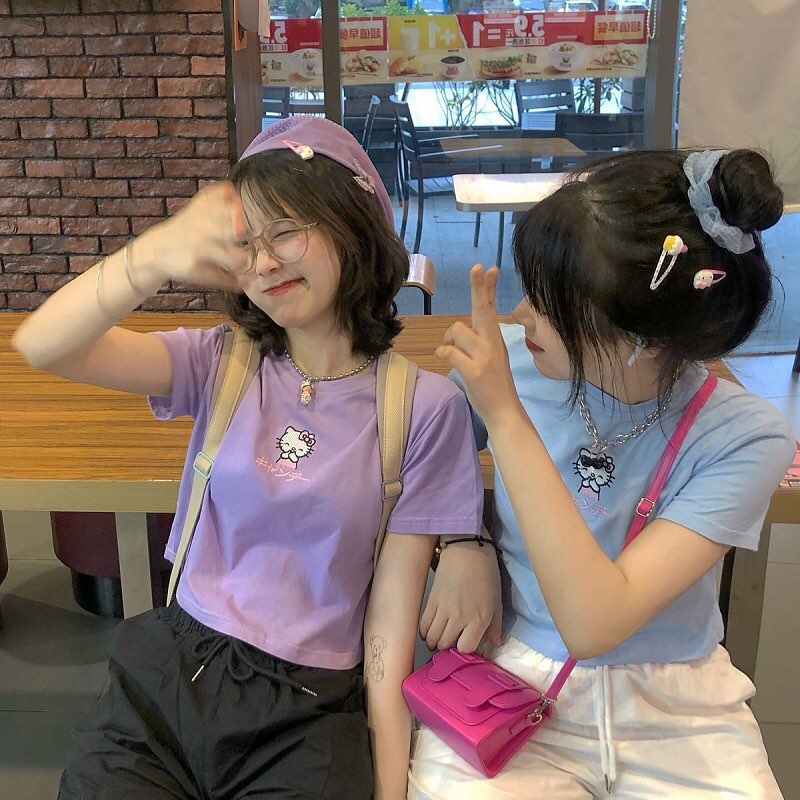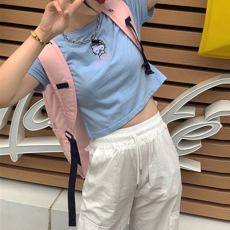 Cute Cat Kitten Embroidery Anime Cartoon Crop Top Short Sleeve Shirt T-shirt Top Summer Casual E-Girl Kawaii Korean Japanese Harajuku Streetwear