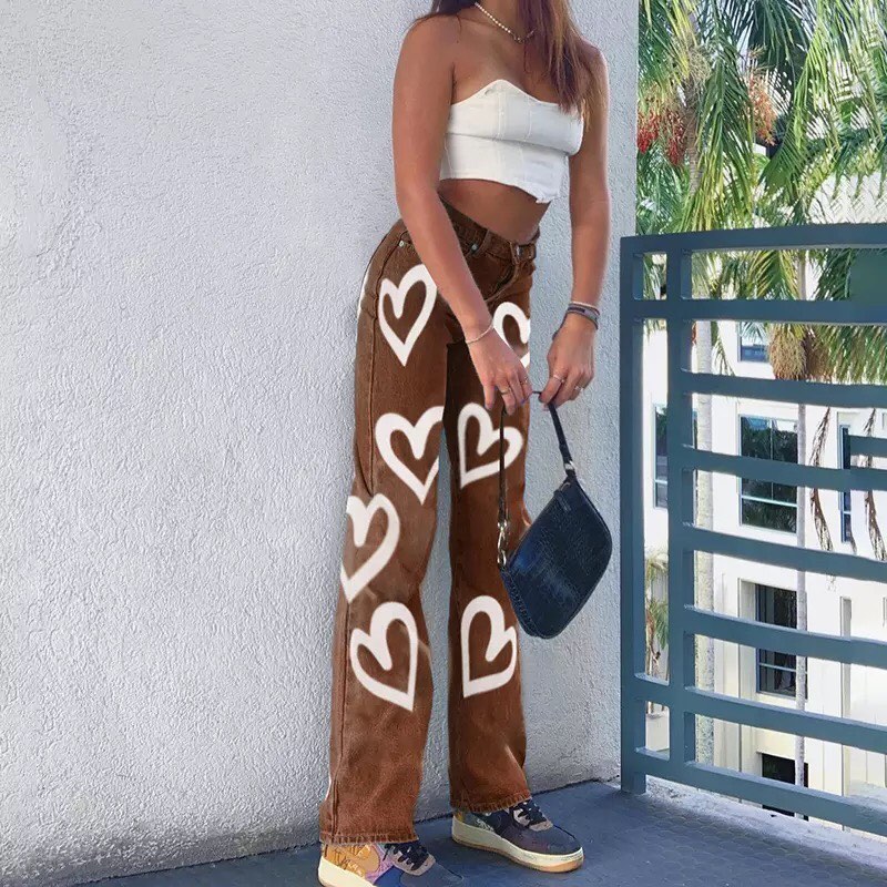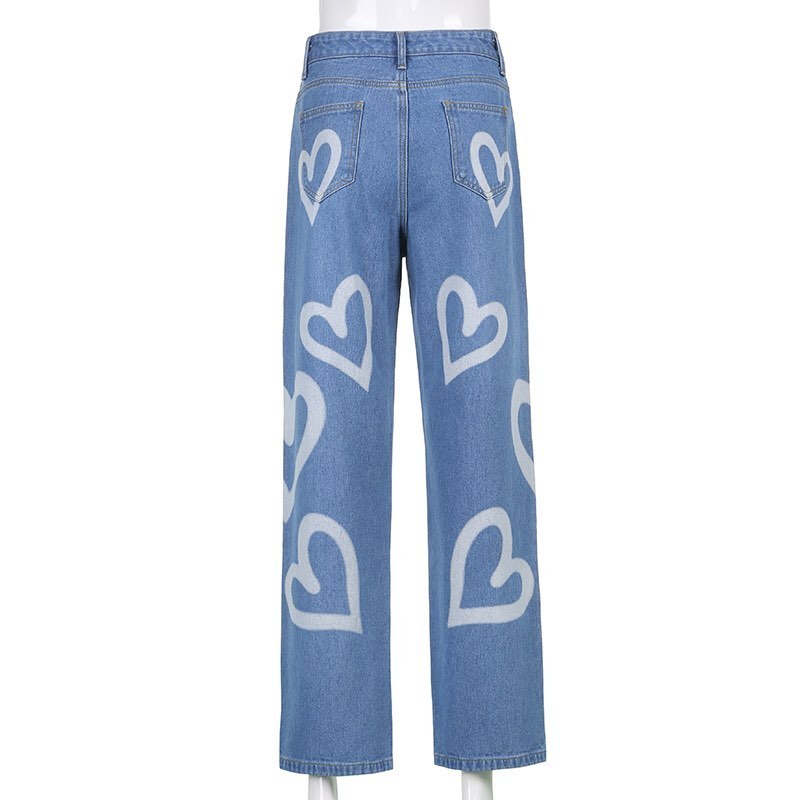 Cute 90s Vintage Heart Print Baggy Mom Jeans Denim High Waisted Trousers Pant Aesthetic Summer Party E-Girl Kawaii Korean Japanese Harajuku Streetwear