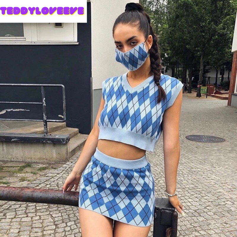 Cute Vintage 90s Argyle Plaid 2 Piece Co-ord Set Knit Sleeveless Tank Crop Top Mini Skirt Aesthetic E-Girl Kawaii Korean Japanese Harajuku Streetwear
