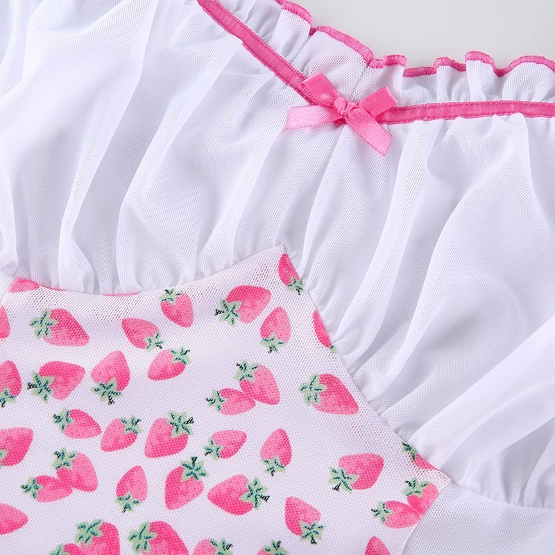 Cute Strawberry Milkmaid Patchwork Frill Ruched Mesh Crop Top Sleeveless Shirt Summer Aesthetic E-Girl Kawaii Korean Japanese Harajuku Streetwear