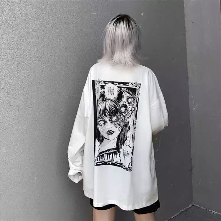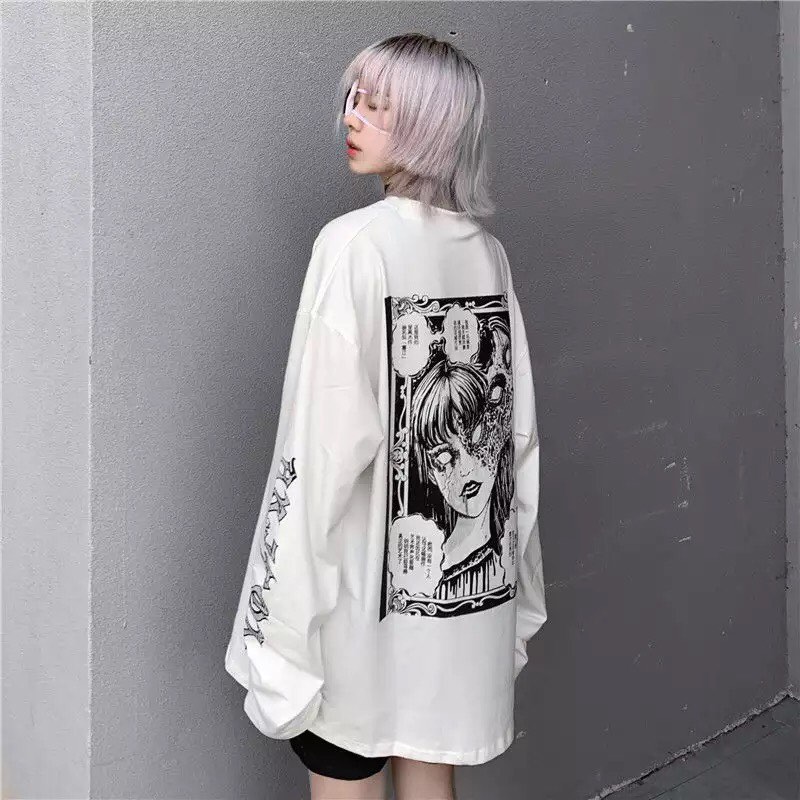 White Dark Anime Girl Cartoon Print Long Sleeve White T-Shirt Oversize Loose Vintage Goth Aesthetic E-Girl Kawaii Korean Japanese Harajuku Streetwear