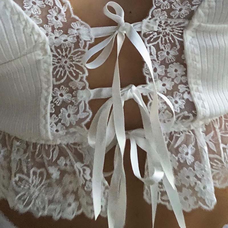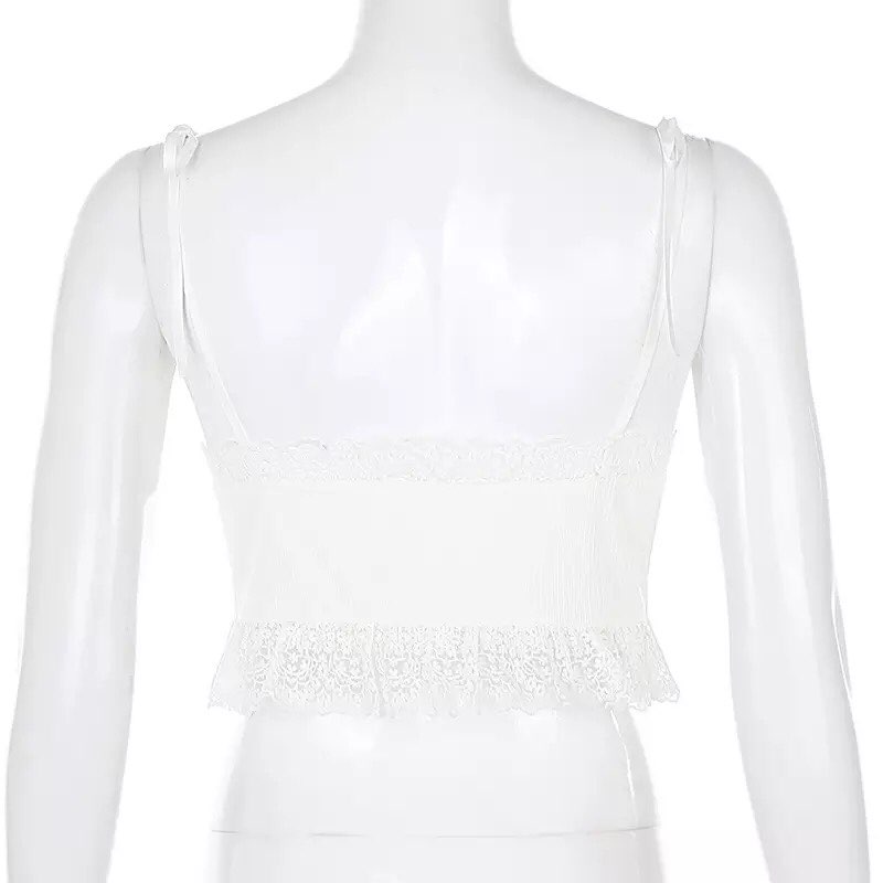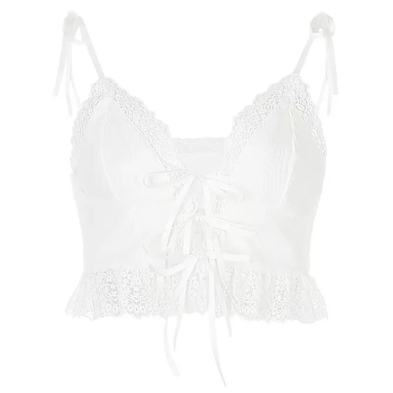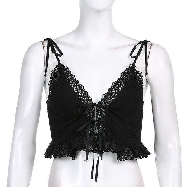 Sexy Lace Frill Bow Tie Up V Neck Crop Top Sleeveless Camisole Spaghetti Strap Club Aesthetic Goth E-Girl Kawaii Korean Japanese Harajuku Streetwear