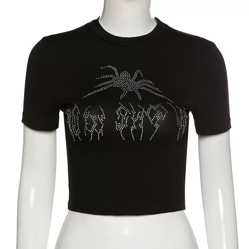 Sexy Black Spider Rhinestone Graphic Crop Top Short Sleeve T-shirt Vintage Punk Goth Aesthetic Casual Summer E-Girl Kawaii Korean Japanese Haraju