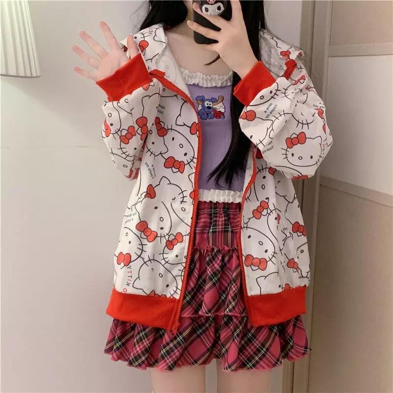 Cute Kitty Cat Cartoon Print Oversized Zipper Hoodie Sweatshirt Long Sleeve Pullover Aesthetic Casual Summer E-Girl Kawaii Korean Japanese Harajuku