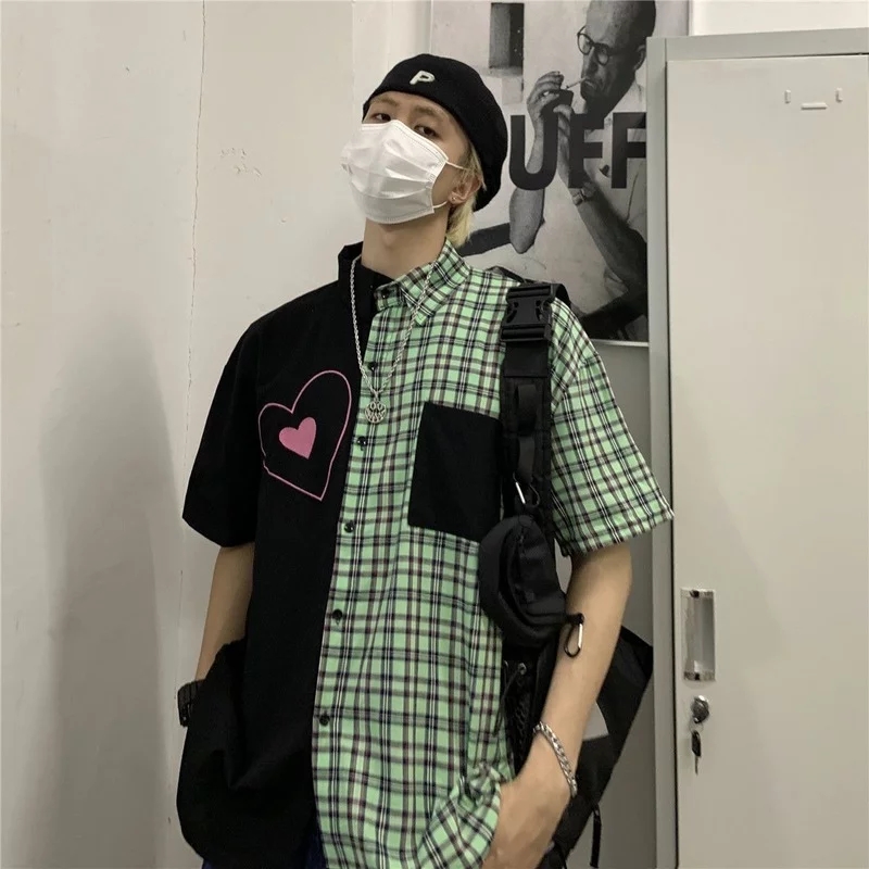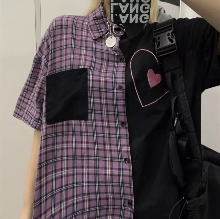 Cute Heart Pocket Plaid Patchwork Vintage Blouse Short Sleeve T- Shirt Top Aesthetic Casual Summer E-Girl Kawaii Korean Japanese Harajuku