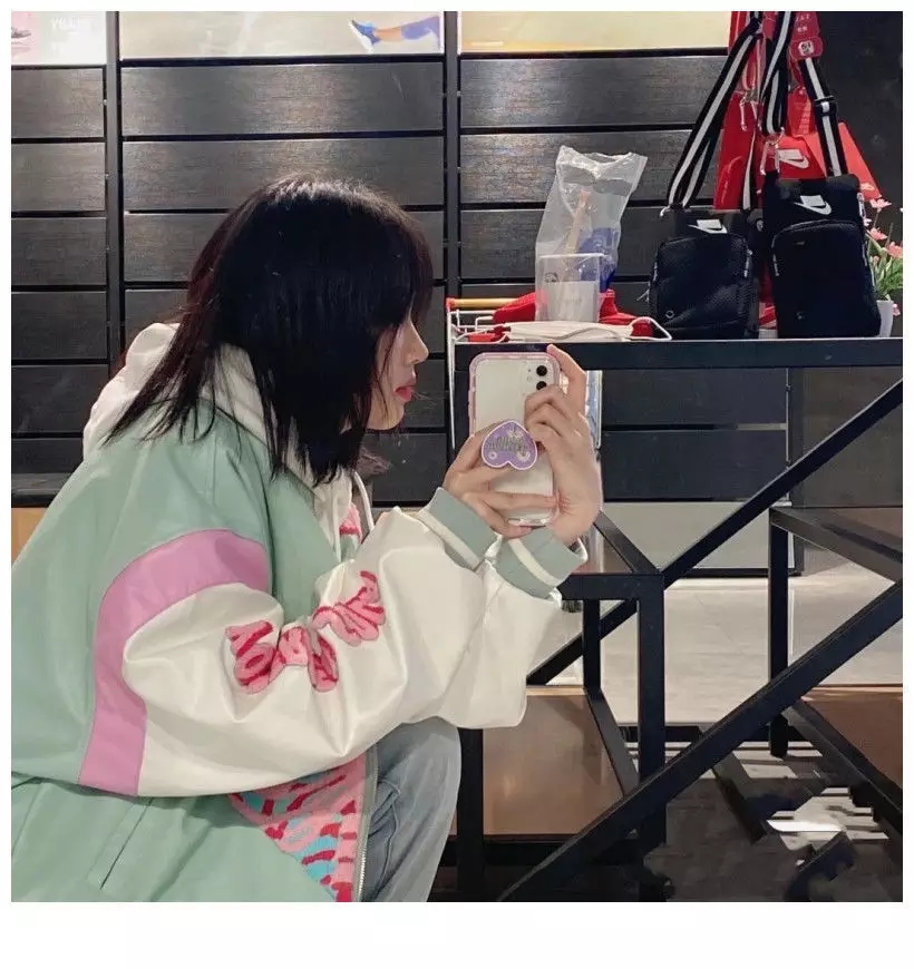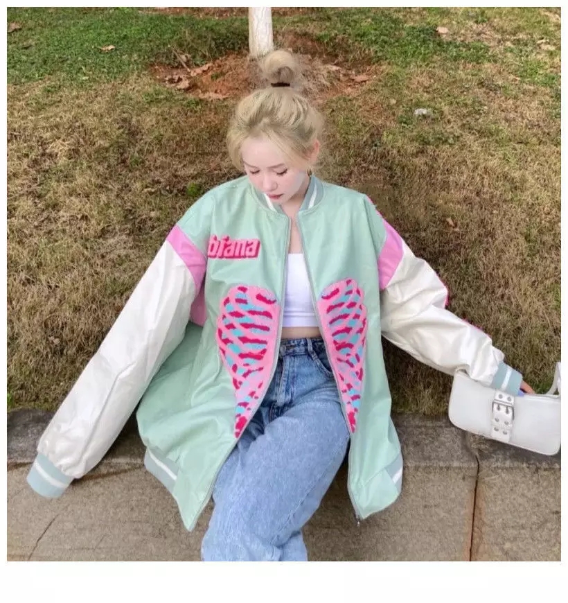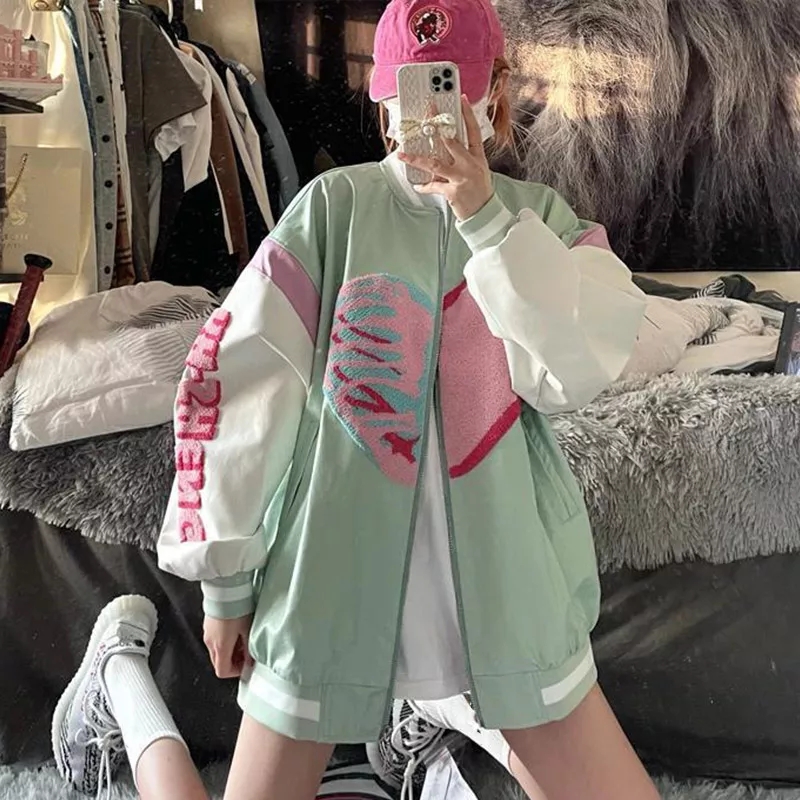 Retro Vintage Pastel Heart Ribs Print Oversized Long Sleeve Zipper Hoodie Sweatshirt Aesthetic Casual E-Girl Kawaii Korean Japanese Harajuku