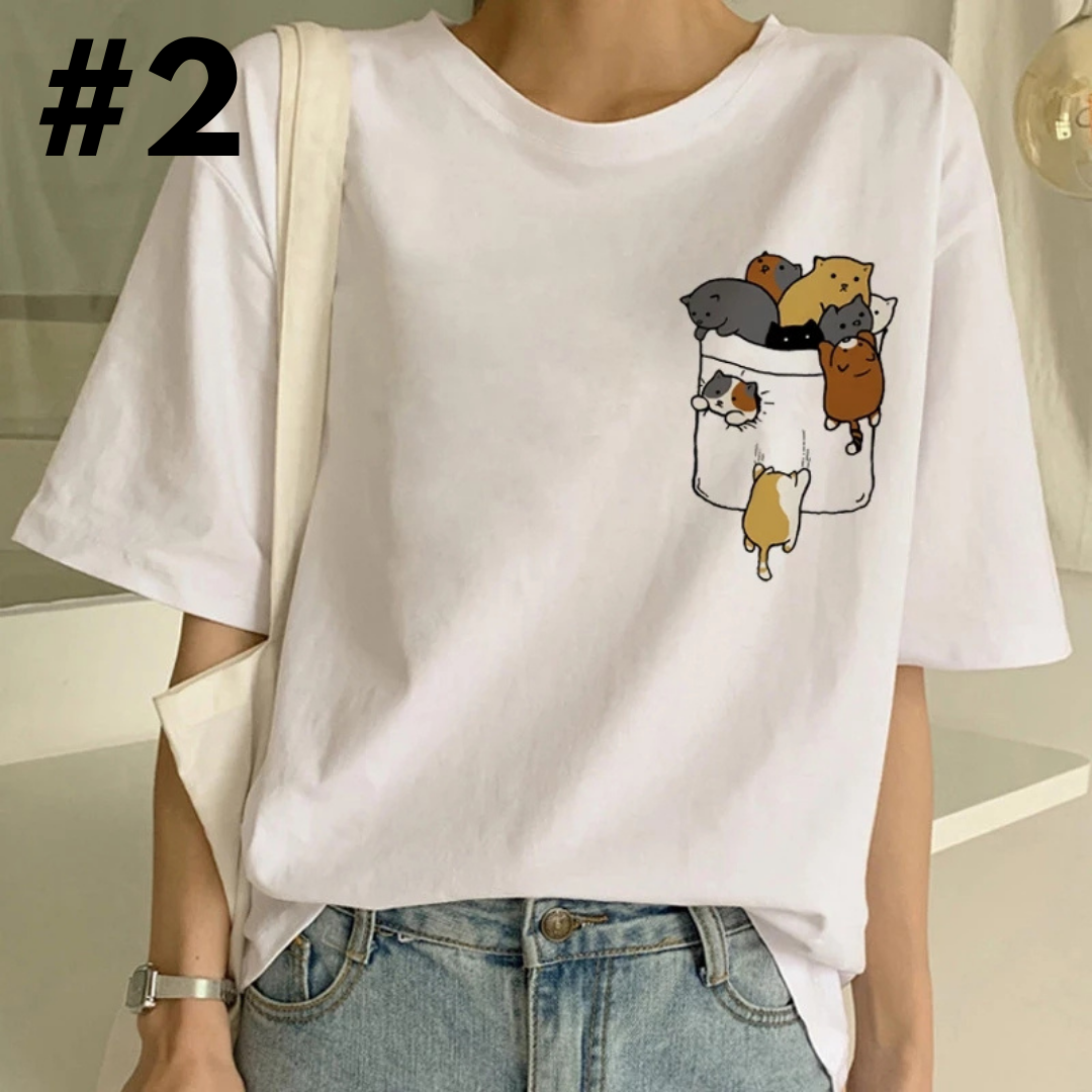 Cute Cat Starry Night Powerline Print Short Sleeve T-shirt Vintage Aesthetic Casual E-Girl Kawaii Korean Japanese Harajuku