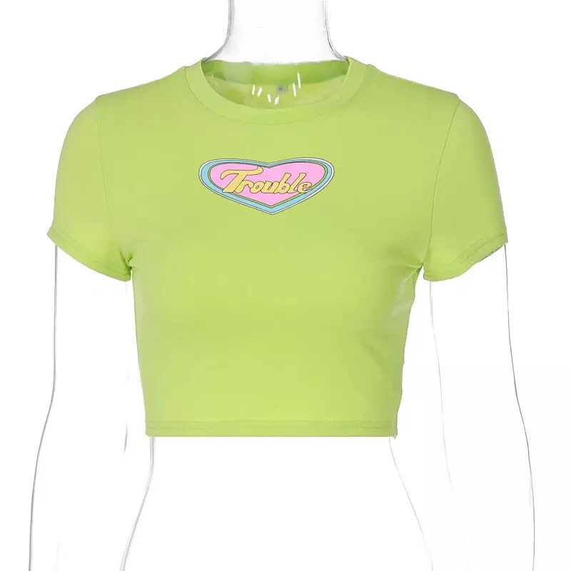 White Vintage Trouble Heart Graphic Print Short Sleeve Shirt Crop Top Summer Aesthetic Casual E-Girl Kawaii Korean Japanese Harajuku