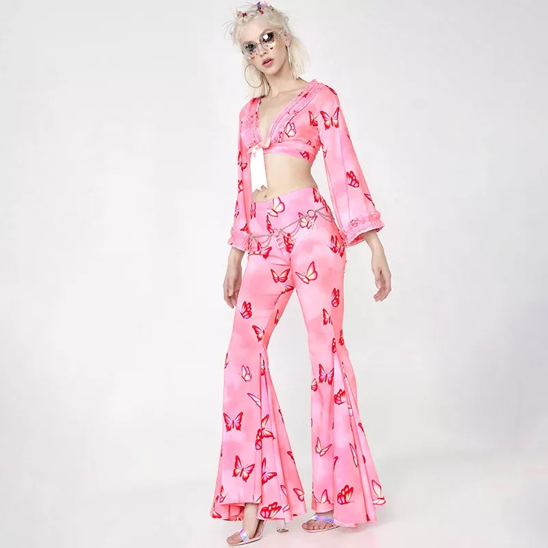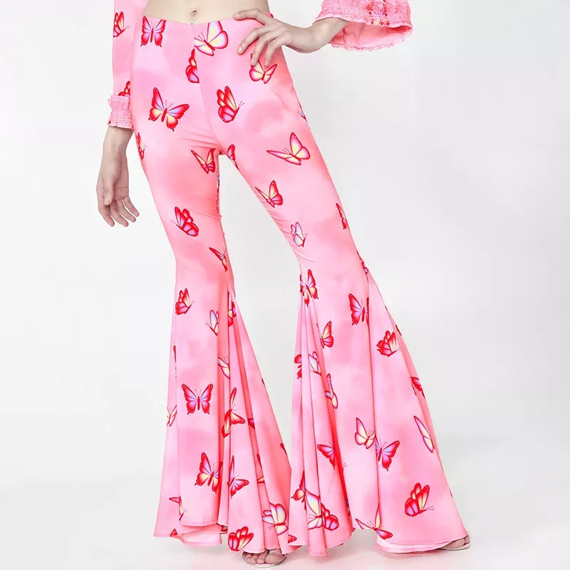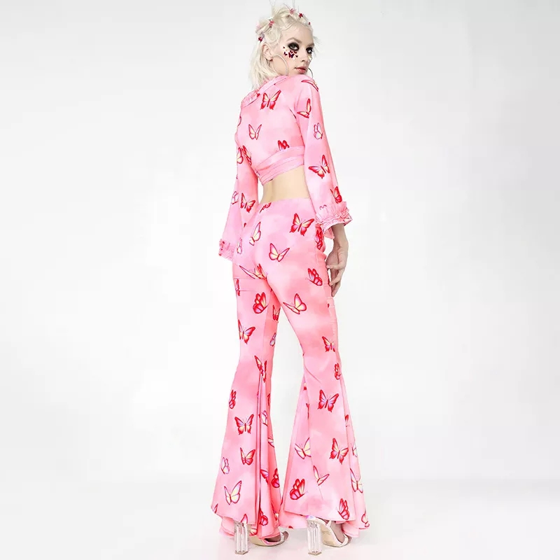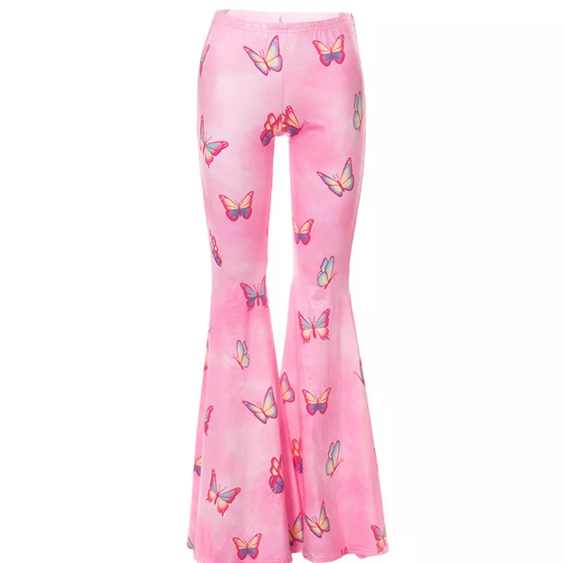 Pink Butterfly Low Waist Flare Bell Bottom Pants Rave Festival Aesthetic Casual E-Girl Kawaii Korean Japanese Harajuku
