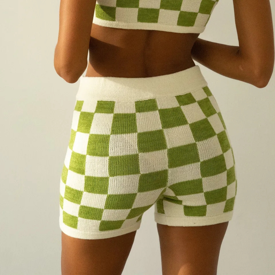 2PCS Green Checkered Knit Crop Top + Shorts