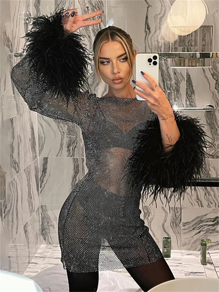 Glitter See Through Mesh Faux Feather Long Sleeve Dress