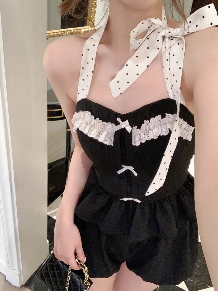 2PCS Vintage Polka Dot Bow Halter Top + Shorts