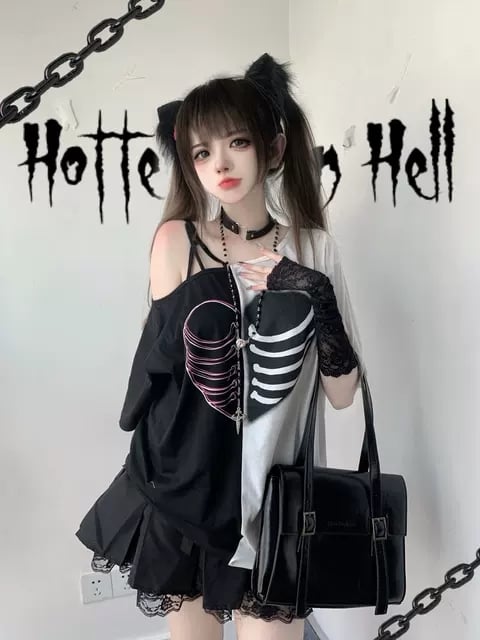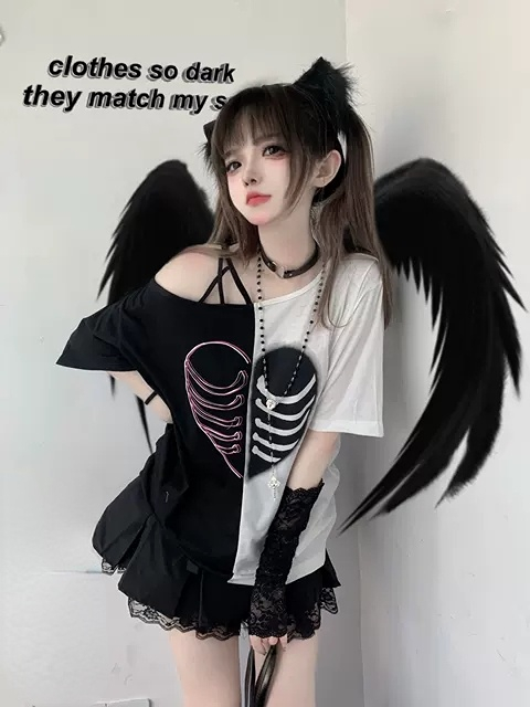 Black & White Heart Rib Skull Short Sleeve T-shirt