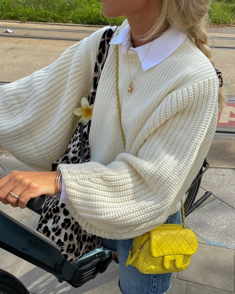 White Cable Knit Lantern Sleeve Sweater